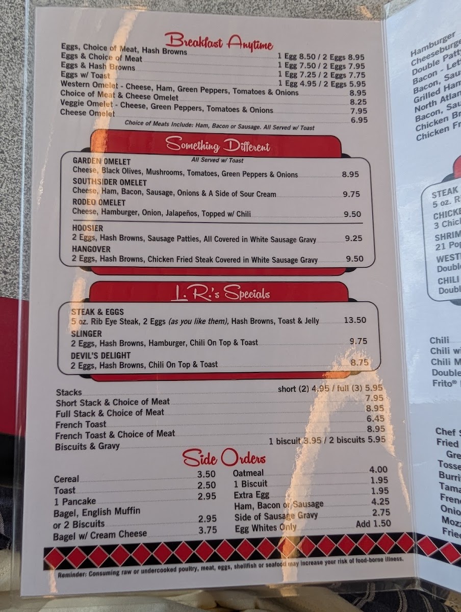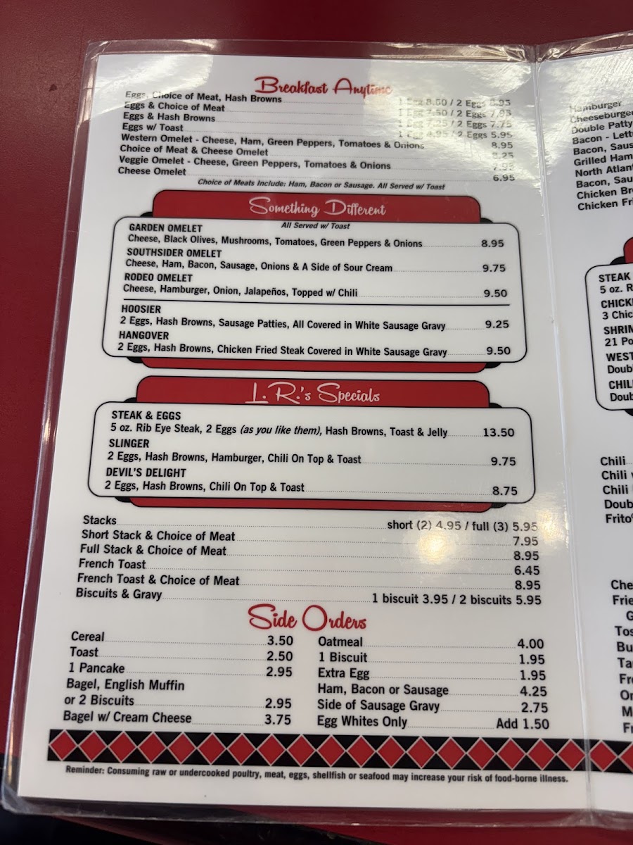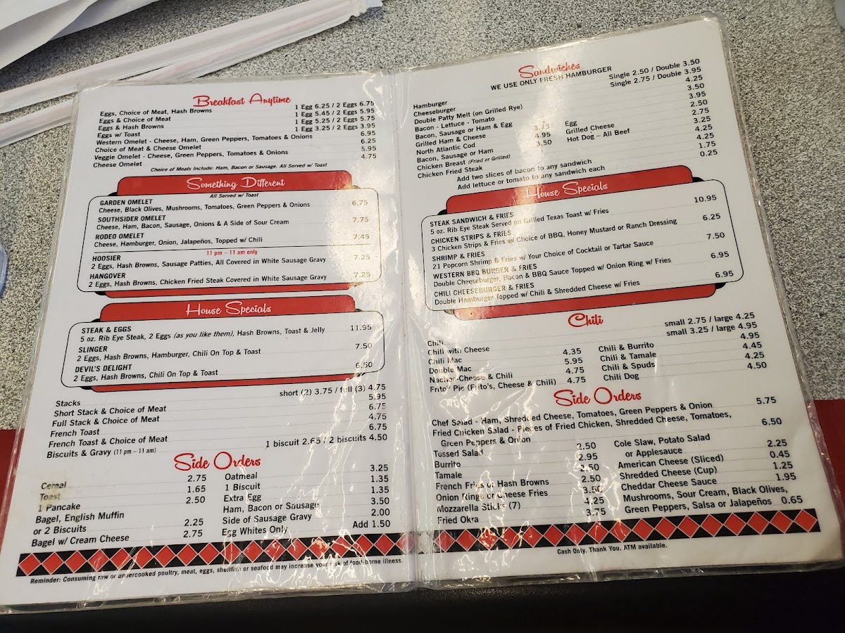 Overall, the menu is suitable for breakfast, brunch, or casual lunch, offering quick and straightforward selections with a focus on traditional diner cuisine. Visitors can expect a range of egg dishes, sandwiches, and sides typical of a breakfast restaurant, structured to accommodate both smaller orders and full, hearty meals.
